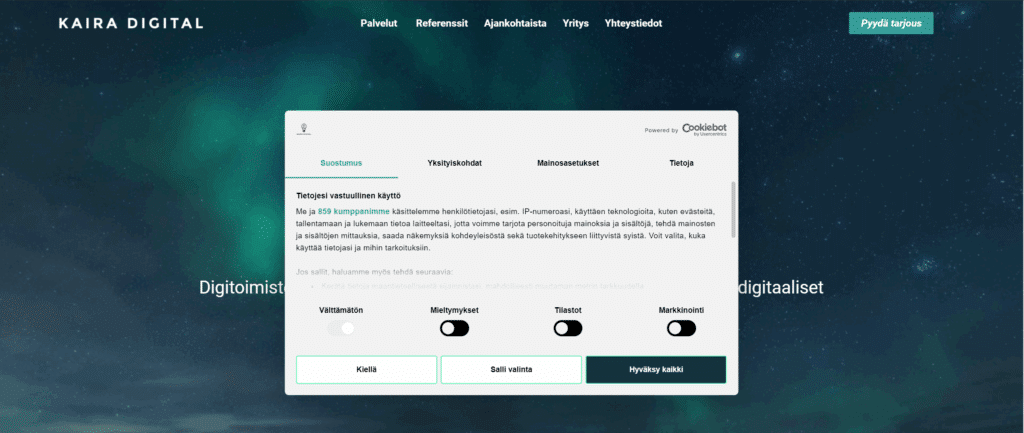 Yllä esimerkki kuva Cookiebot evästekyselystä, kun tulet ensimmäistä kertaa verkkosivuillemme.