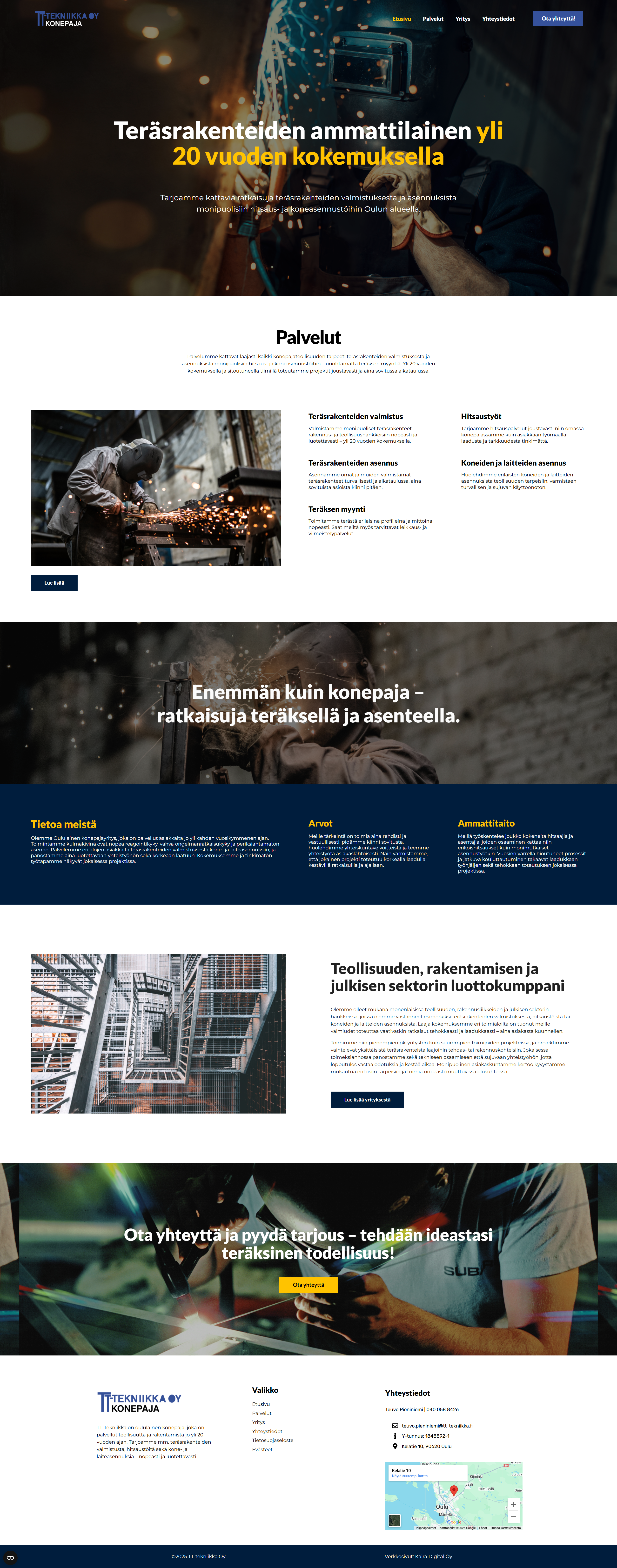 TT-Tekniikka Oy on kokenut ja arvostettu konepajayritys, joka on erikoistunut monipuolisiin metallialan ratkaisuihin. Aiemmat kotisivut eivät kuitenkaan vastanneet yrityksen asiantuntemusta eivätkä toimineet tehokkaana asiakashankinnan työkaluna. Sivusto kaipasi selkeämpää rakennetta, modernimpaa ulkoasua ja parempaa käytettävyyttä, jotta potentiaaliset asiakkaat löytävät palvelut helposti.